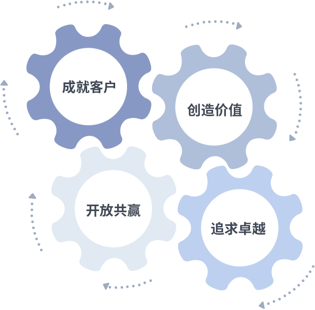 成就客户是一切决策的出发点,,,创造价值是衡量所有工作的标准,,追求卓越是我们做事做人的态度,,开放共赢是我们的格局也是最终的结果。。。价值观的齿轮环环相扣,,推动着组织里的每个人不断向前。。。。