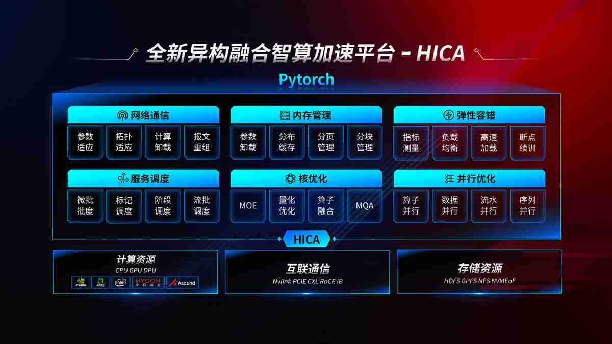 通过自研的服务层、、中间适配层、、以及调度编排算法,,采用数据并行、、、模型并行等多种并行方式,,,把并行计算任务进行有效的分解,,使其分别由相应的软件栈和算力资源来承接。。。。当GPU资源变化,,HICA可以实时动态调度计算子任务并调整模型拓扑和架构,,,,以充分聚合各种算力资源。。。
