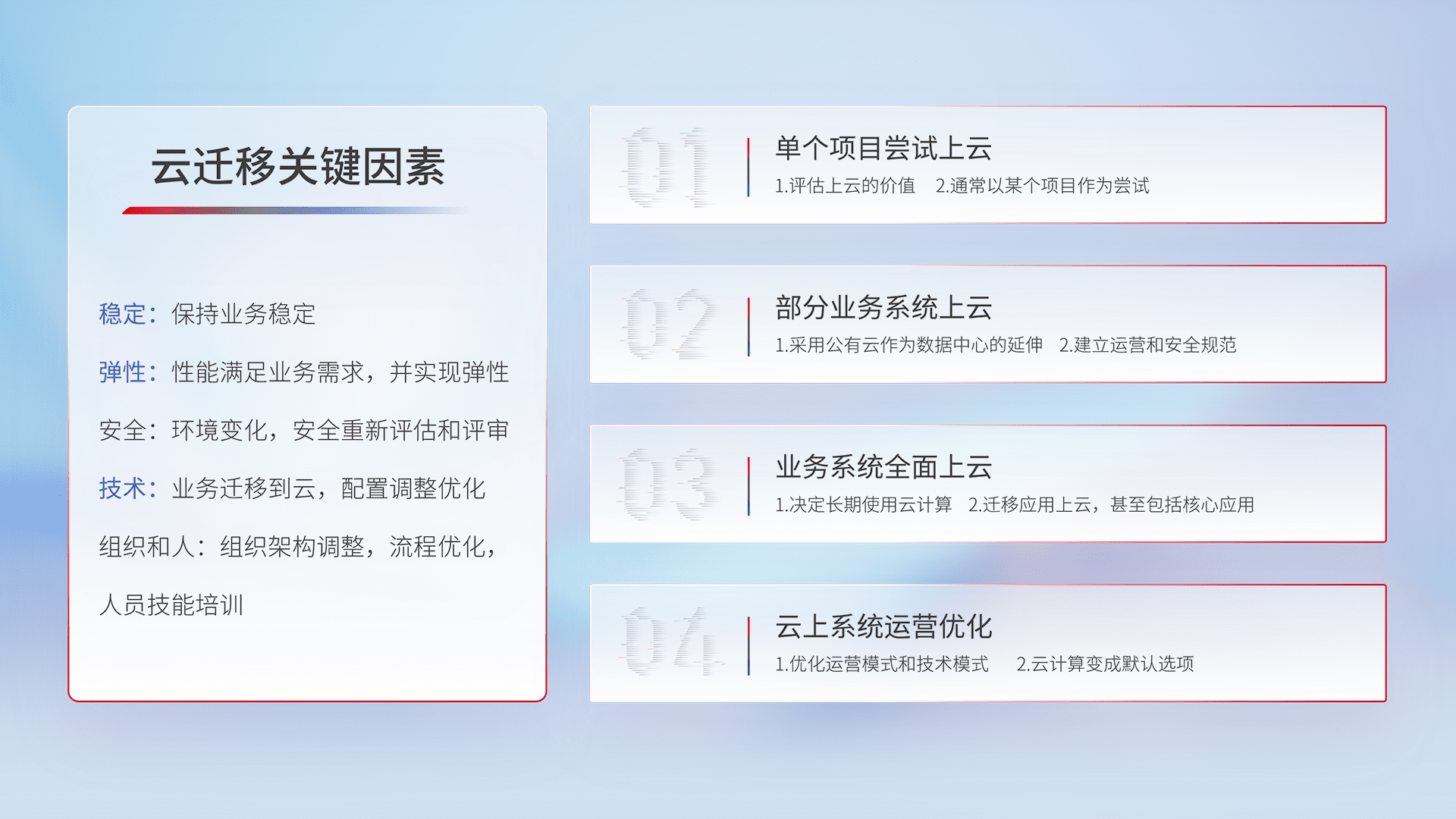 结合实际业务,,,从规划设计、、、、云平台选型、、、云原生改造、、、数据迁移、、、、集成交付,,,,迁移全过程为客户识别最佳上云路径,,,,做好风险识别管理,,,设计网络架构、、、身份权限、、、安全审计合规、、、、操作审计、、、日志审计、、、、监控告警策略、、、、多站点容灾设计等,,,,对云上基础设施进行整体规划,,,提升IT治理水平,,,以满足弹性、、高可用、、、高性能的需求。。。。