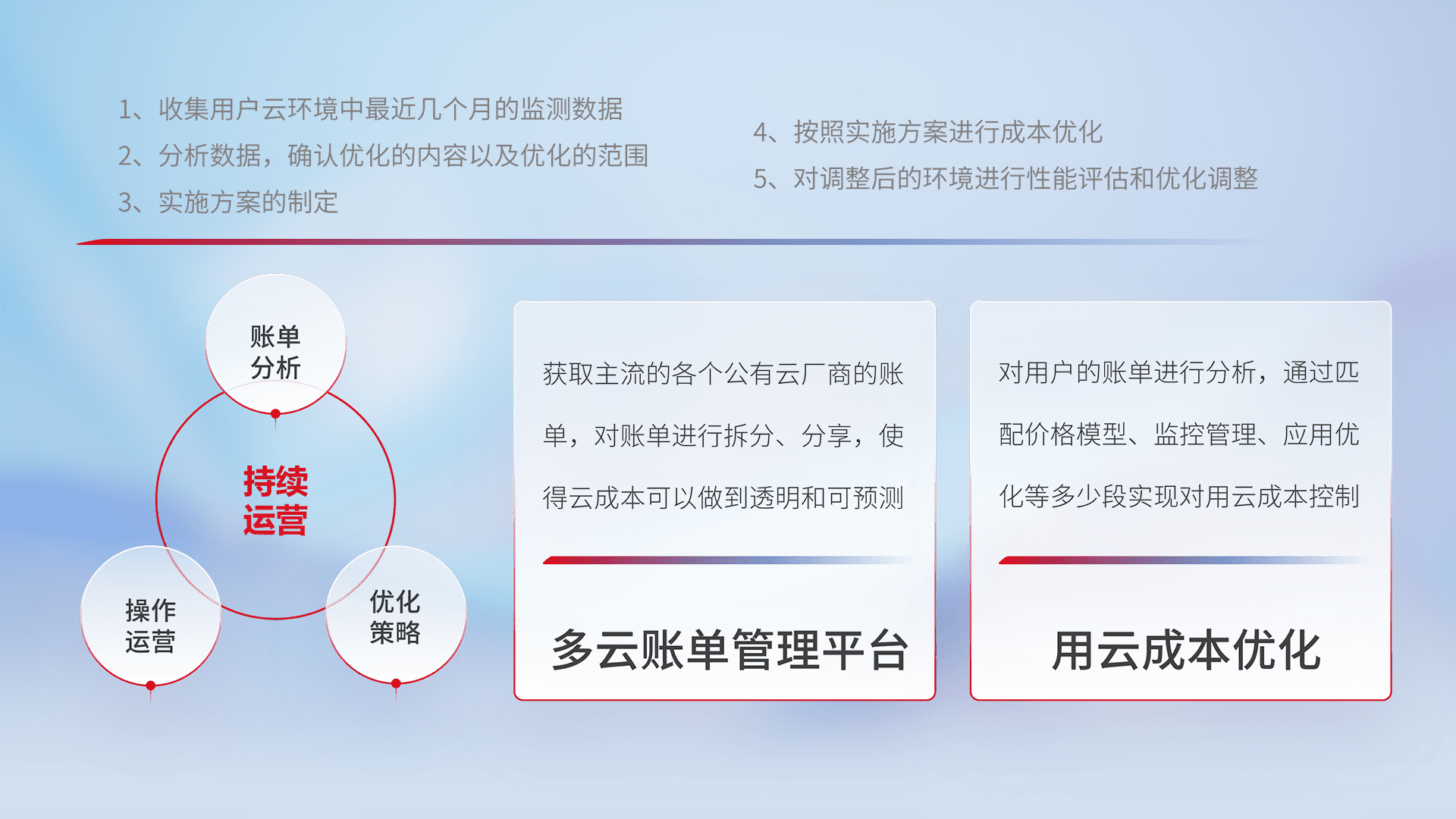 通过多云纳管,,,,以统一的资源数据模型把客户的云资源进行抽象和封装,,,,进而实现对多云资源的统一操作,,,保障云资源管理的可靠性、、、稳定性与可用性。。量身定制化运维内容,,配置、、、、开发运维、、、补丁管理、、、、备份、、监控、、认证和访问管理、、、审计和日常巡检等,,,,保障在用云过程中的可靠度,,稳定度以及高可用率。。。。